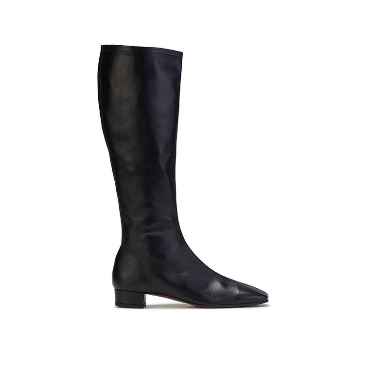 حذاء من الجلد الأسود ذو القدم المربعة ذو الكعب المسطح، أسلوب عصري وموضة